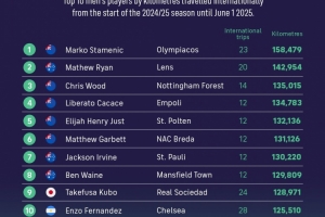 体育资讯6月13日讯 FIFPRO统计了本赛季球员进行国际旅行的里程,并列出榜单。